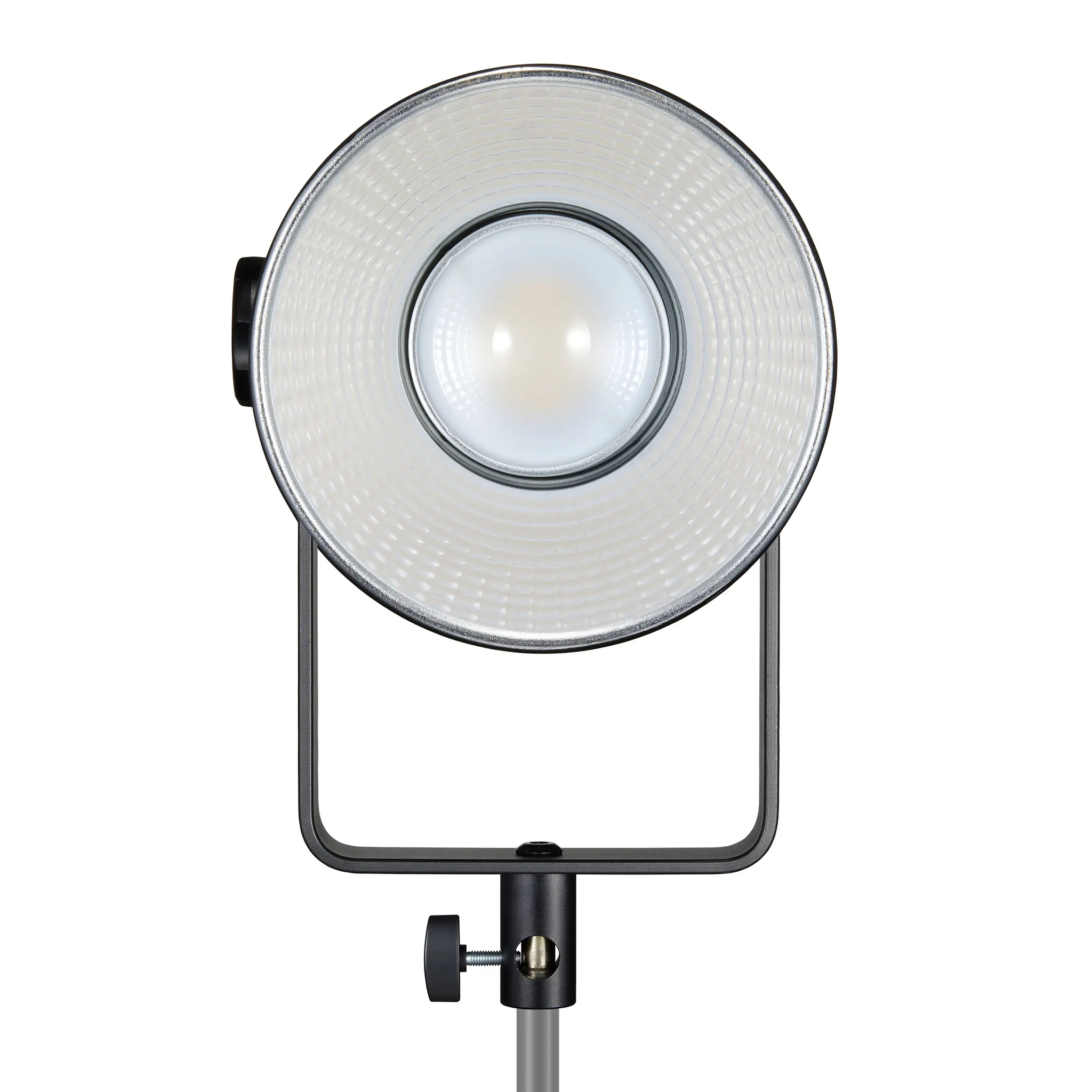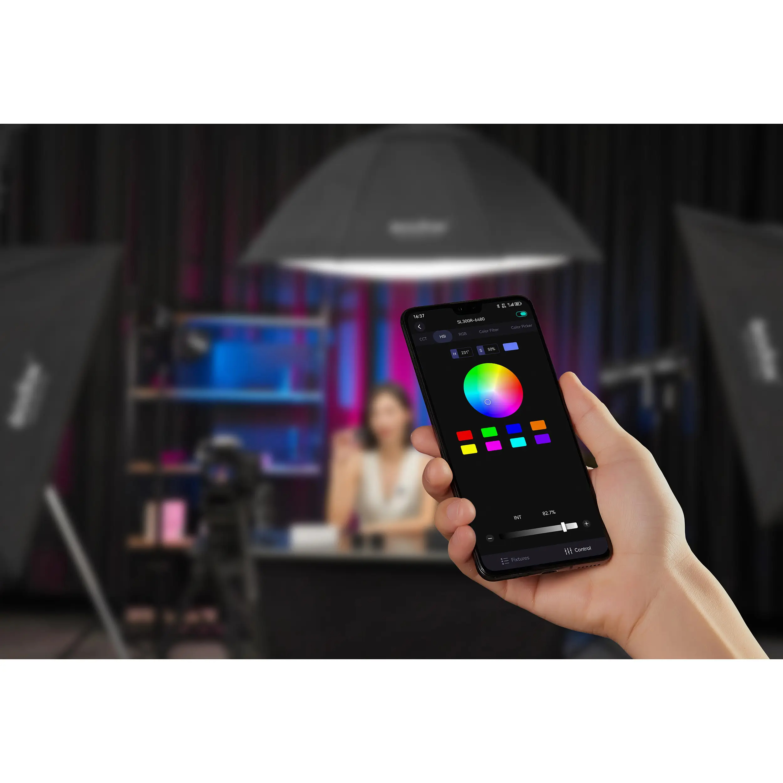 Устройство обеспечивает освещенность 43300 люкс на расстоянии 1 метр и оснащено системой точной цветопередачи (CRI/TLCI >96). Функция отключения вентилятора позволяет работать в бесшумном режиме, что важно при синхронной записи звука. Прибор управляется через мобильное приложение, DMX-консоль, радио-пульт или панель управления с дальностью сигнала до 50 метров.