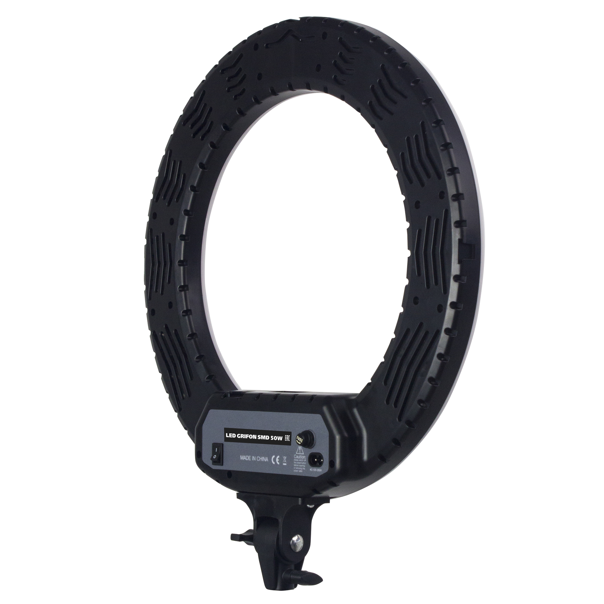 Grifon LED SMD 50 W - круговая светодиодная панель с возможностью регулировки интенсивности свечения и цветовой температуры. В приборе установлено 480 светодиодов, мощностью 48 Вт цветовой температурой от 3200K до 5600K. Размер внешнего диаметра светового кольца 48.5 см, внутренний диаметр 33 см. Яркость потока регулируется от 1 до 100% диммером. Общая освещенность составляет 4200 LM. Питание прибора осуществляется от сети 220 В. Имеет крепление для смартфона на гибком держателе. Прибор устанавливается на стойку. (приобретается отдельно).