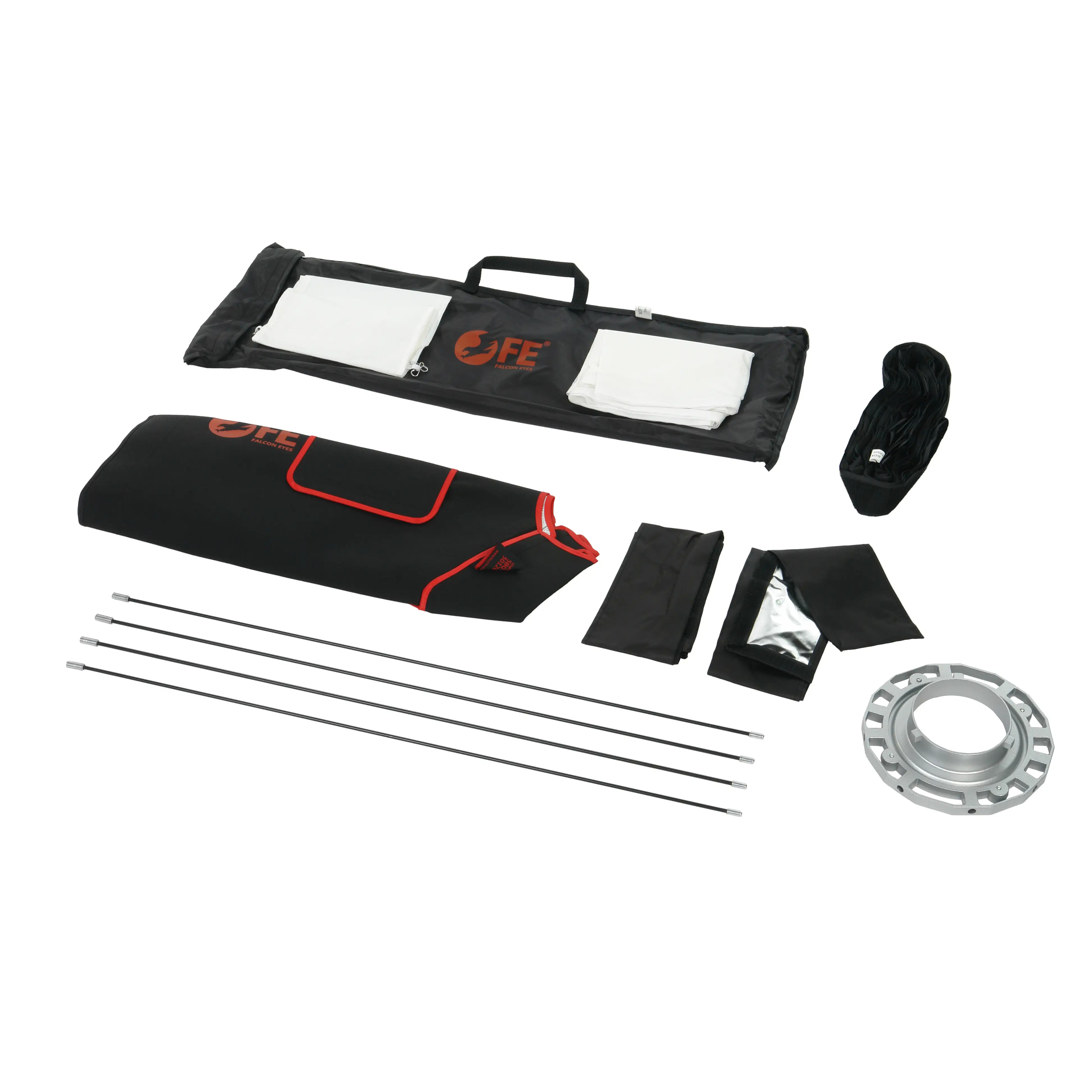 Каркас софтбокса выполнен из жаропрочной синтетической ткани с серебристой внутренней поверхностью, что обеспечивает долговечность при интенсивной эксплуатации. Два вентиляционных окна с фиксацией на липучках обеспечивают циркуляцию воздуха и отвод избыточного тепла. Конструкция включает четыре стальные спицы и литой алюминиевый адаптер со сменным байонетным кольцом Bowens.