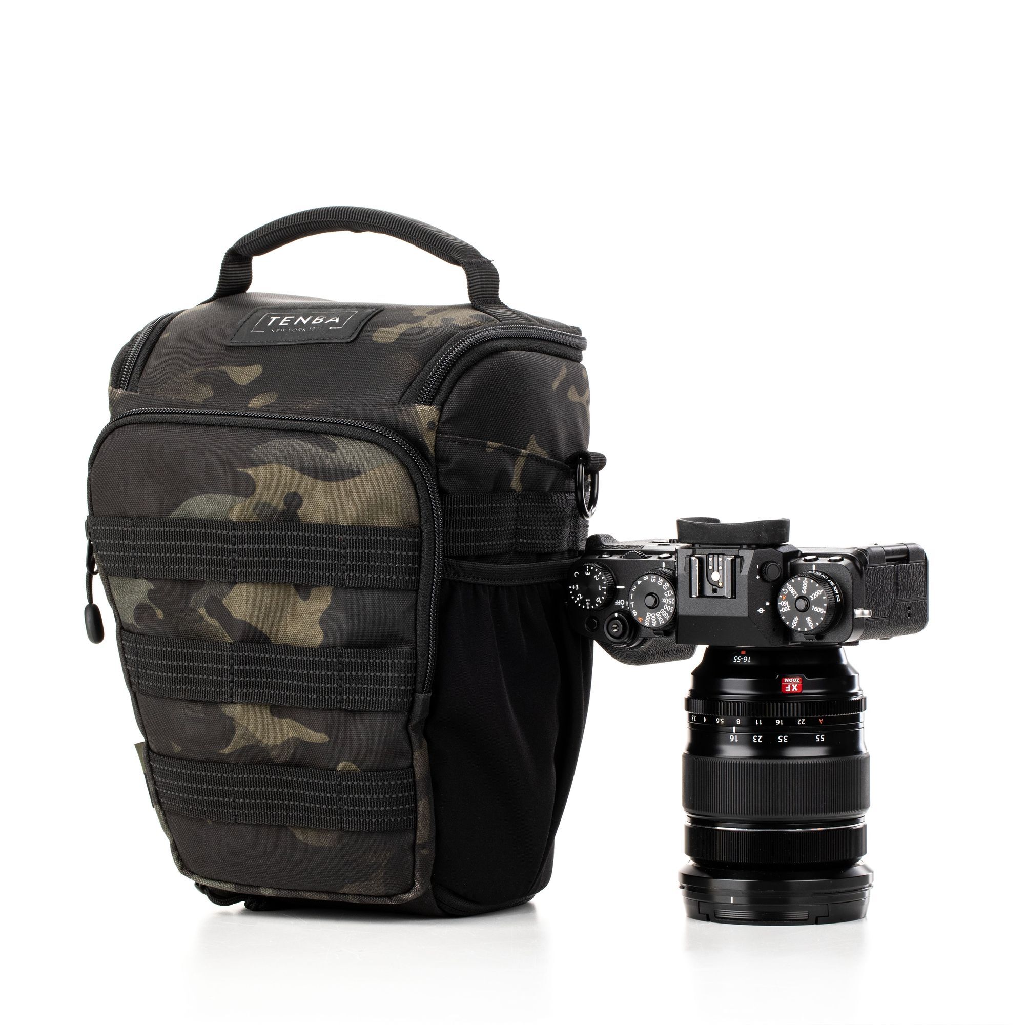 В стандартном виде холстер Tenba Axis v2 предназначен для беззеркальной или зеркальной цифровой камеры с установленным объективом 24-70. Также подходит для переноски DJI Mavic и других компактных дронов. Расстегнув молнию на дне холстера, вы можете установить камеру с объективом 70-200 или 24-70 не снимая бленду.